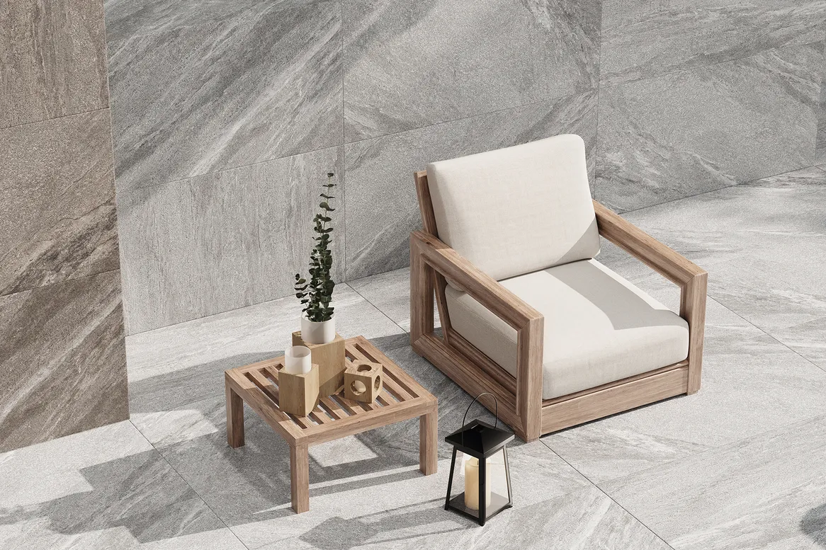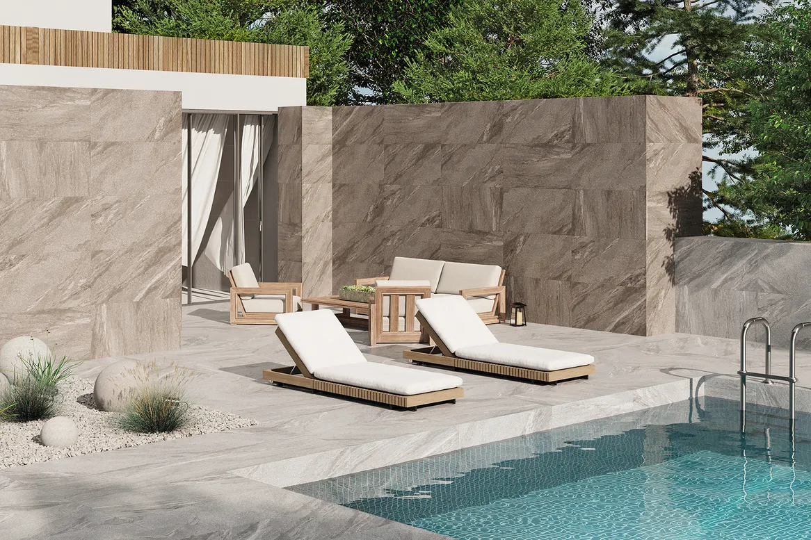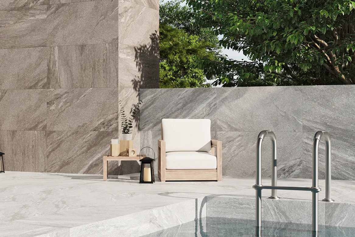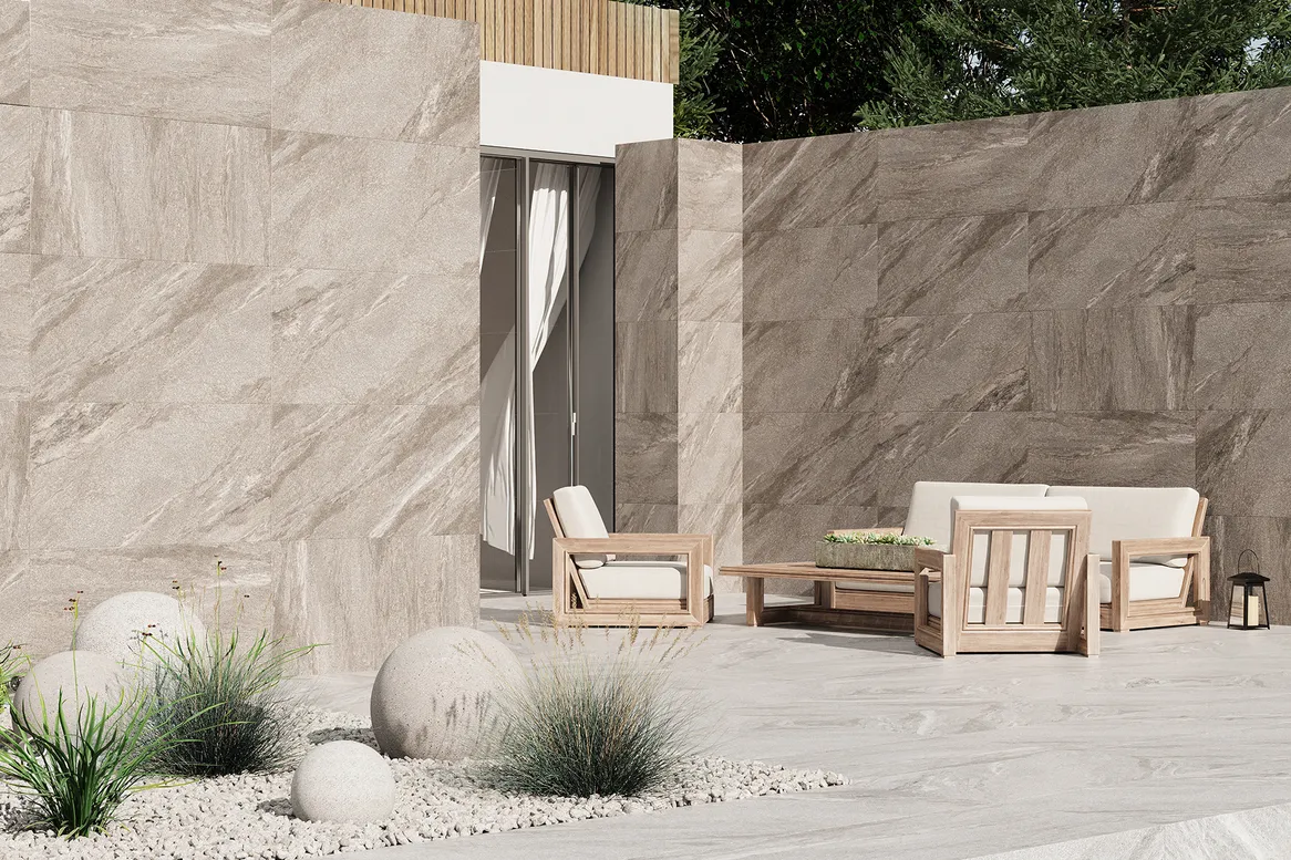 Коллекция сочетает в себе сдержанные оттенки с противоскользящей поверхностью (R11), придавая изысканность и безопасность открытым пространствам. Плитка с поверхностью Anti – slip (R11), устойчива к скольжению, что делает ее безопасным и практичным вариантом для функциональной эстетики и отличным выбором для террас, дворов и зон у бассейнов.
