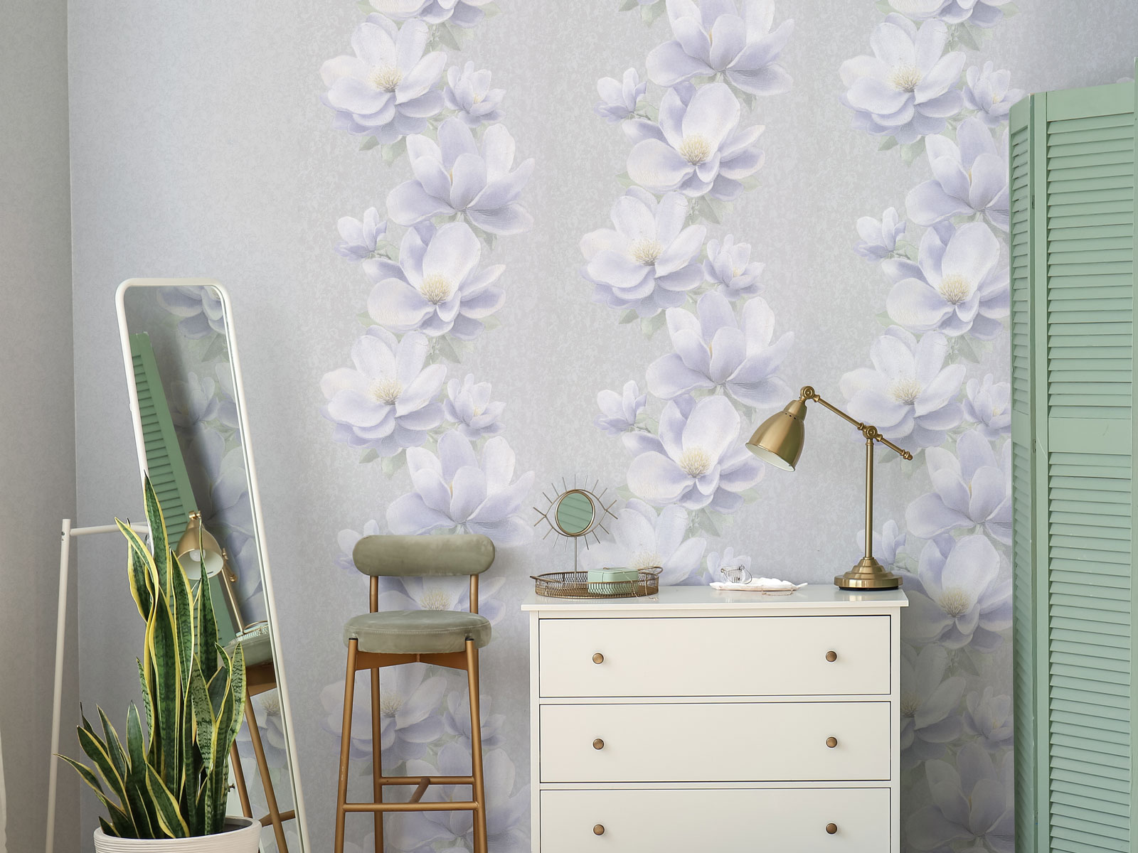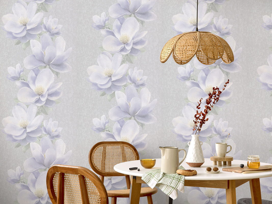 Лёгкое мерцание декоративных элементов подсвечивает лепестки, придавая рисунку объём. Деликатная игра света создаёт приглушённое сияние, а рельефная фактура делает стены выразительными.