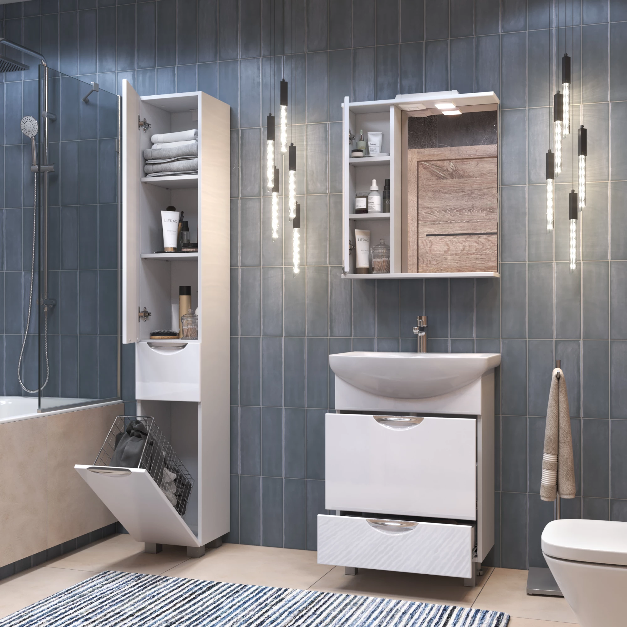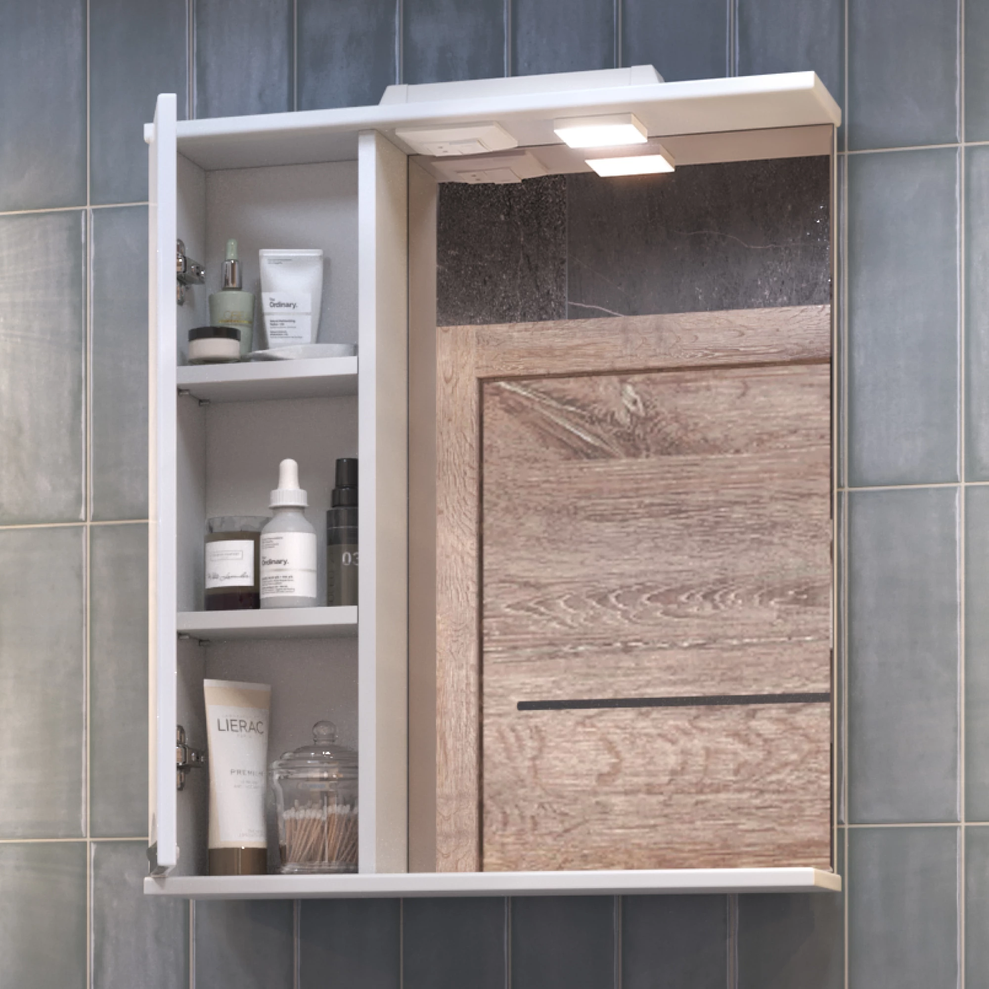 Комплектация: 2 полки ЛДСП; петли с механизмом доводчика, 1 светодиодный светильник, включатель с розеткой