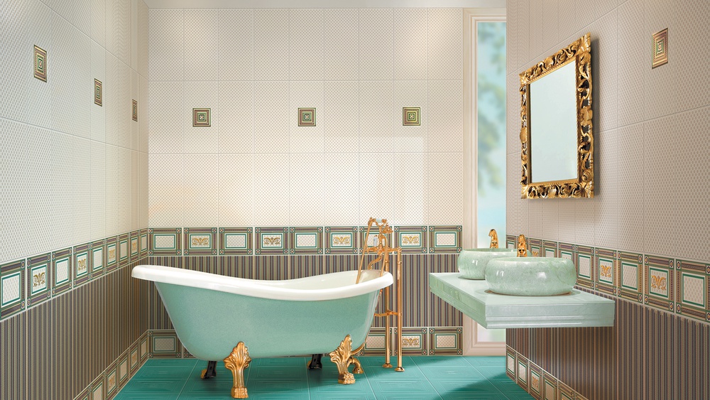 Облицовочная настенная плитка Золотой от Ceramique Imperiale доступна в белом и бирюзовом цвете с мелким крапчатым орнаментом. В линейке также присутствует плита с пестрым полосатым рисунком, напоминающим текстильный принт. Для оформления цоколя можно взять объемные модули с филенкой, выполненные в стилистике панелей boiserie.